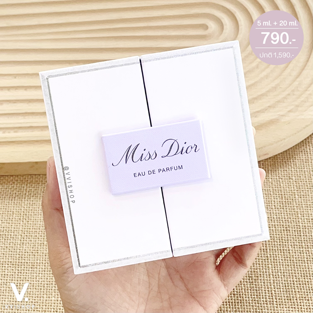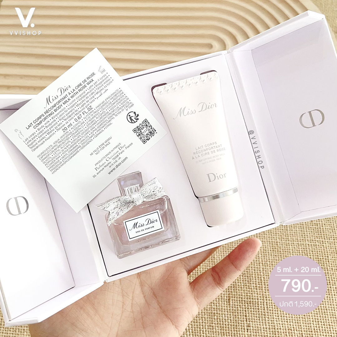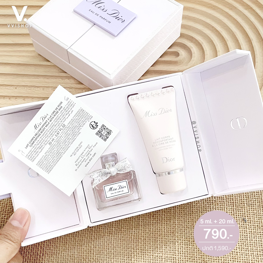 Dior Miss Dior Eau de Parfum & Body Milk Gift Setในกล่องประกอบด้วย- Miss Dior Eau de Parfum 5 ml. กลิ่นกุหลาบหอมหวานดุจน้ำผึ้ง โอบล้อมด้วยดอกไม้สดชื่นและผลไม้ฉ่ำๆ ทำให้ได้กลิ่นที่เย้ายวน อ่อนโยน และอบอุ่น- Miss Dior Body Milk 20 ml. บอดี้น้ำหอม สามารถพกติดกระเป๋าได้สะดวก ใช้เป็นแฮนด์ครีมบำรุงมือ มอบกลิ่นหอมให้คนข้างๆ ต้องเหลียวมองทุกครั้งที่หยิบใช้ชุดเซตน้ำหอมที่สะท้อนถึงความรักอันแสนบริสุทธิ์ กลิ่นหอมเย้ายวนด้วยดอกไม้นานาพันธุ์ รังสรรค์ปรุงแต่งจนได้กลิ่นหอมที่ลงตัวเป็นเอกลักษณ์เฉพาะของคริสเตียน ดิออร์ สุดหรูสัมผัสกลิ่นหอมของดอกลิลลี่ออฟเดอะวัลลีย์สดชื่น และดอกพีโอนีผสมแอปริคอทเปรี้ยวหวาน ให้ความรู้สึกสดใส ร่าเริง เหมือนเดินในสวนดอกไม้ยามเช้า ตามด้วยดอกกุหลาบและพีช หอมหวานแบบน้ำผึ้ง เย้ายวน โรแมนติก ปิดท้ายด้วยมัสก์อ่อนโยน ผสมวานิลลาจากปาปัวนิวกินีที่หวานครีมมี่ มอบกลิ่นที่อบอุ่น นุ่มนวลและติดทนนาน- Top Notes : Iris, Peony, Lily-of-the-Valley- Middle Notes : Rose, Apricot, Peach- Bottom Notes : Vanilla, Musk, Tonga Bean, Sandalwood, BenzoinHOW TO USE