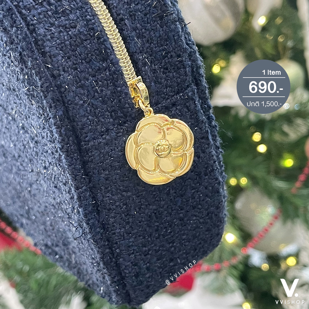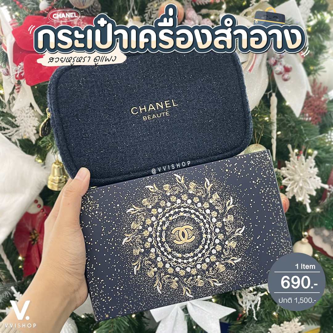 ดีไซน์หรูหราและโดดเด่น มีชื่อ CHANEL BEAUTY อยู่ด้านหน้าและอะไหล่ซิปสีทองประดับด้วยดอกคามิเลียสัญลักษณ์ของแบรนด์ เพิ่มความพรีเมียมให้กับกระเป๋า