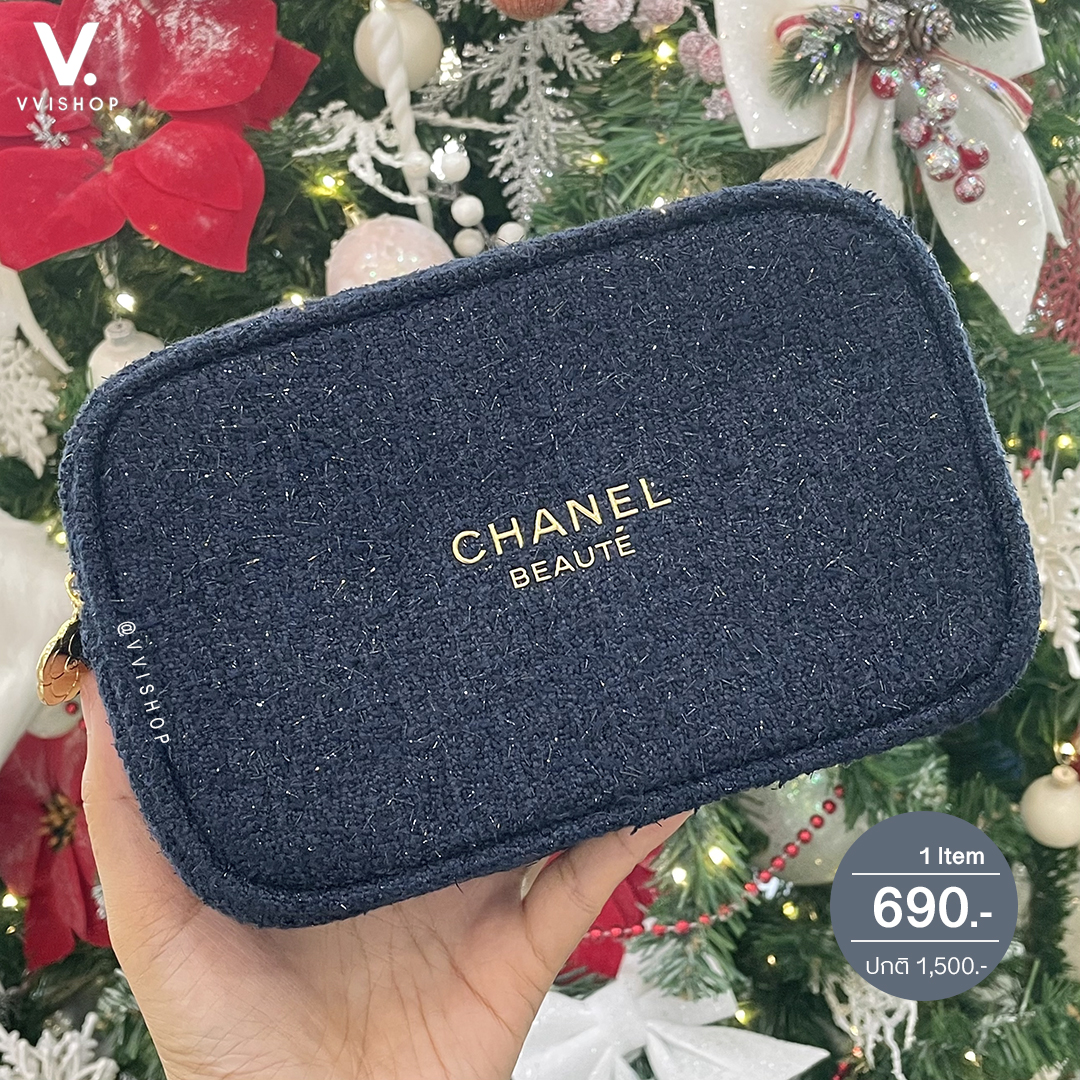 กระเป๋าสุดหรูจาก Chanel Beauty ดีไซน์สวยหรูสะดุดตา สีน้ำเงินมิดไนท์บลู ทำจากผ้าทวีดเอกลักษร์ของแบรนด์มีกลิตเตอร์ระยิบระยับ ตัดกับโลโก้สีทอง มาพร้อมกล่องลิมิเต็ด