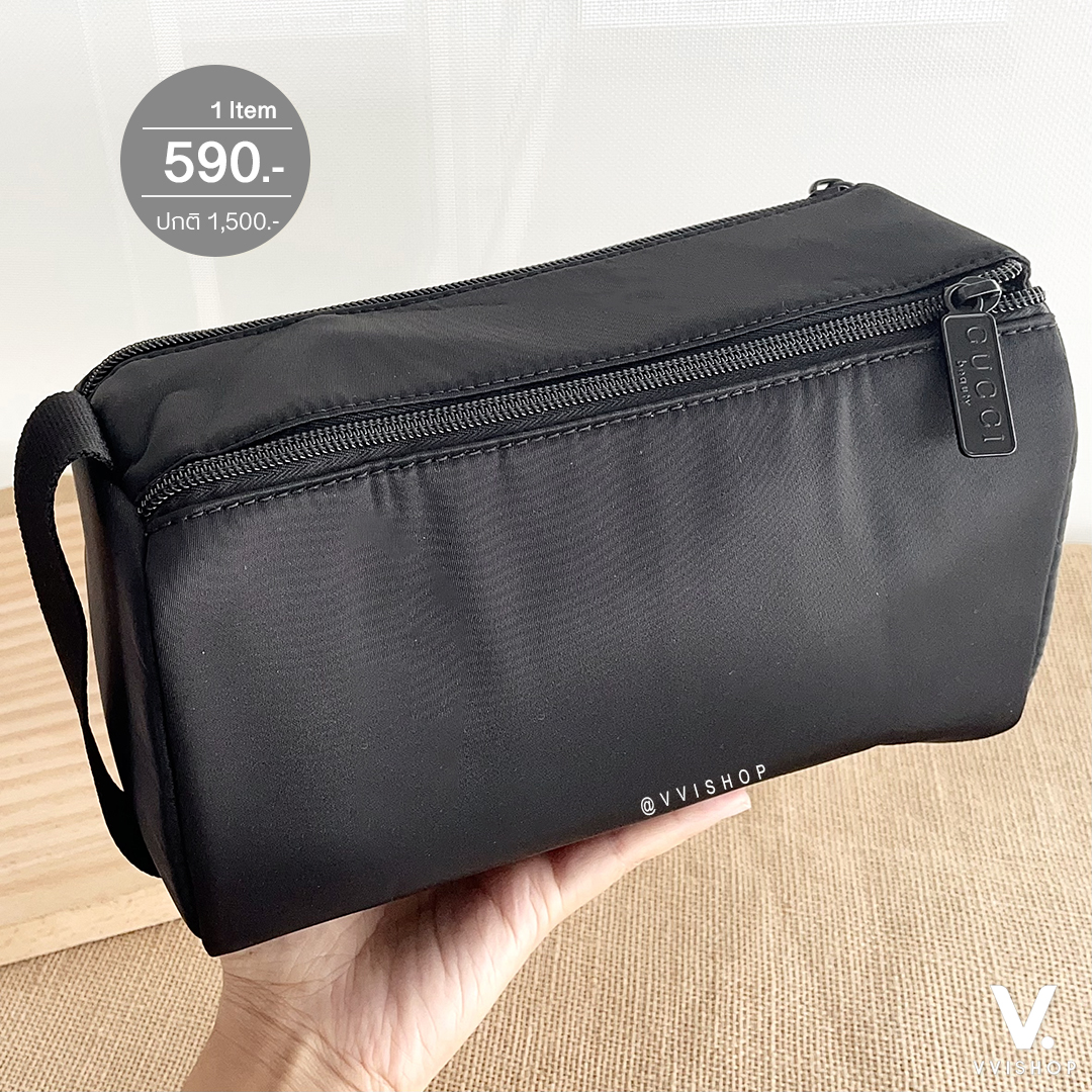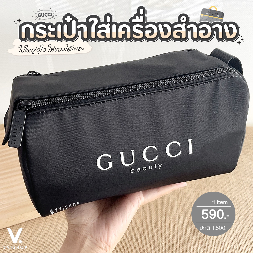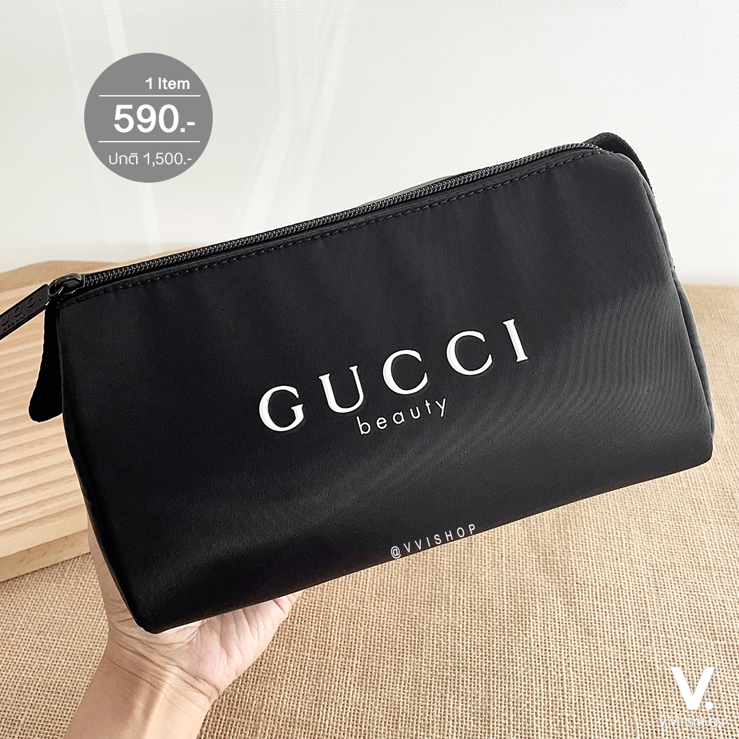 ดีไซน์ทรงตั้งสวยเรียบแต่หรู สีดำสนิทผลิตจากผ้าไนลอนซาติน กันน้ำ เช็ดทำความสะอาดและดูแลรักษาง่าย น้ำหนักเบา มีหูหิ้วด้านข้างพกพาสะดวก ด้านหน้าสกรีนโลโก้ "GUCCI beauty" สีขาวเห็นเด่นชัด ซึ่งเป็นเอกลักษณ์ของไลน์ Gucci Beauty โดยเฉพาะ